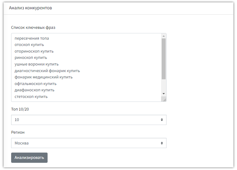 Чтобы анализировать ресурс, предварительно следует собрать список ключевых слов. В сервисе есть опция анализа по регионам. Проанализировать можно 10 или 20 релевантных ресурсов конкурентов. Загрузите список ключевых слов в специальную форму, выберите количество сайтов для анализа и жмите на опцию запуска анализа.